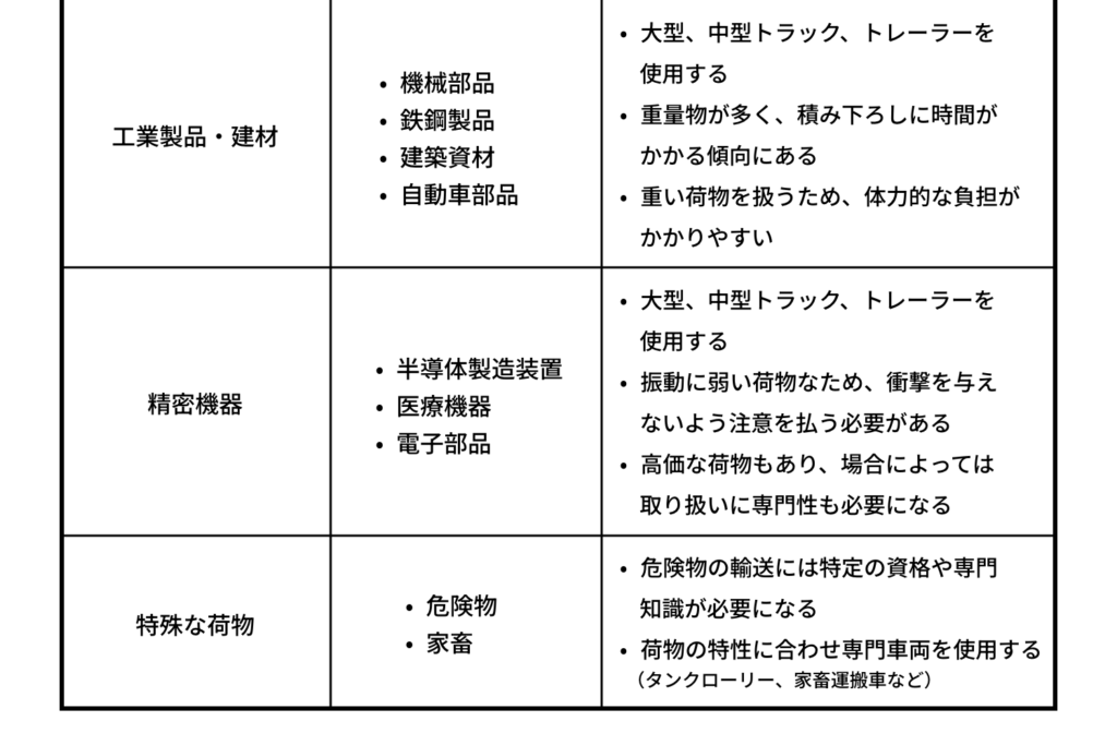 このように、長距離トラックが運ぶ荷物は種類によって必要な車両やスキルが異なります。