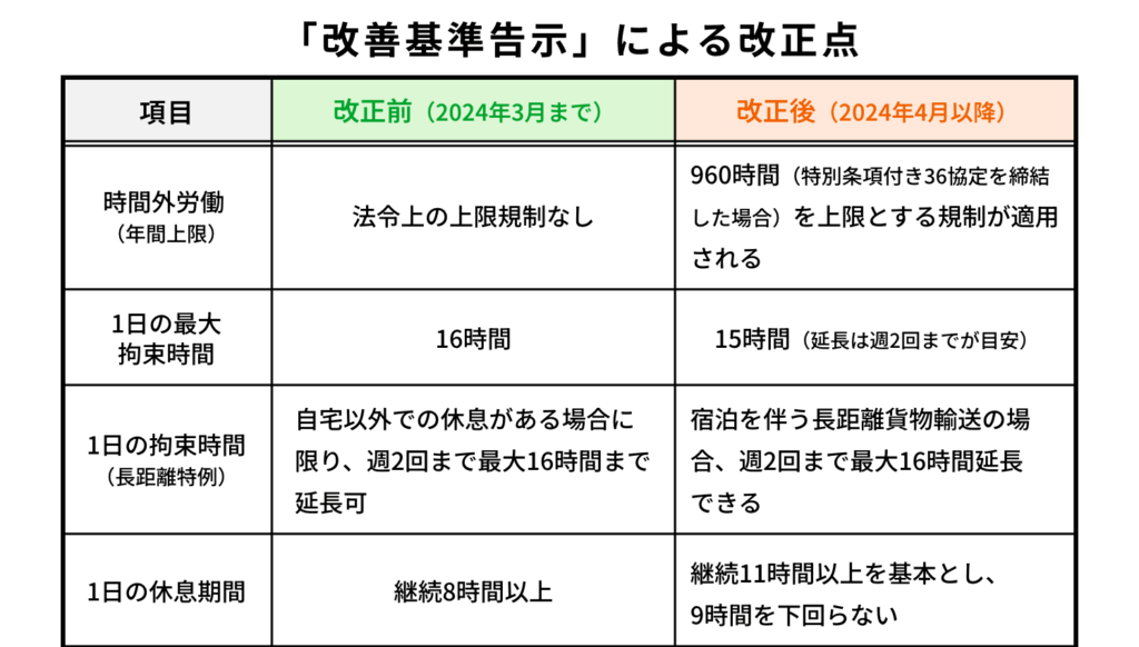 2024年4月に施行された「改善基準告示」により、トラックドライバーの労働条件が大きく変わりました。目的は、長時間労働の是正と安全運転の確保です。